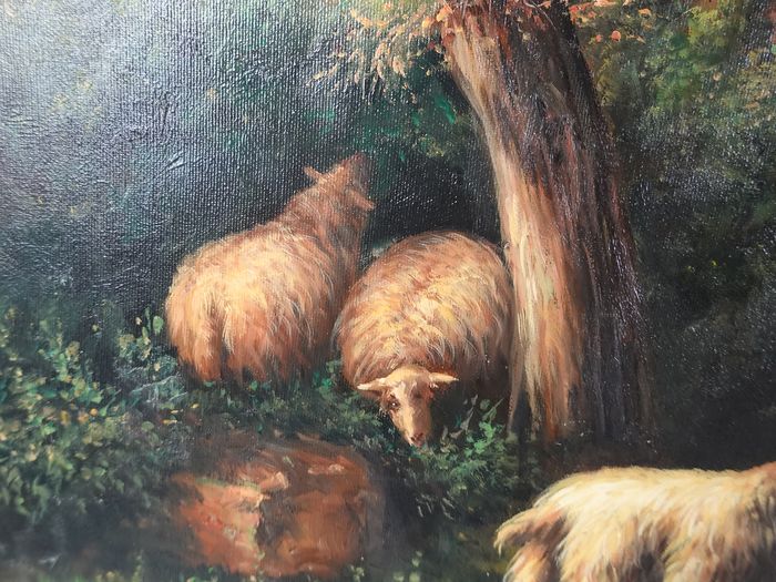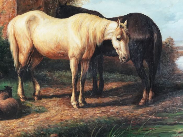 I am offering for auction a charming and large oil on canvas of horses and goats by a stream, next to an old dwelling. Very well painted by unsigned.
