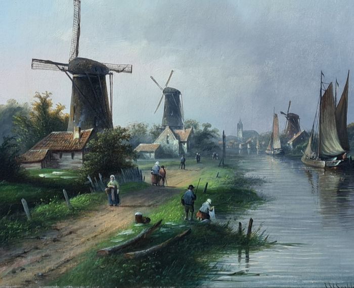 Typical romantic Dutch painting with: mills on a river with a lot of activity with men and women and children on the dike and around the mills.