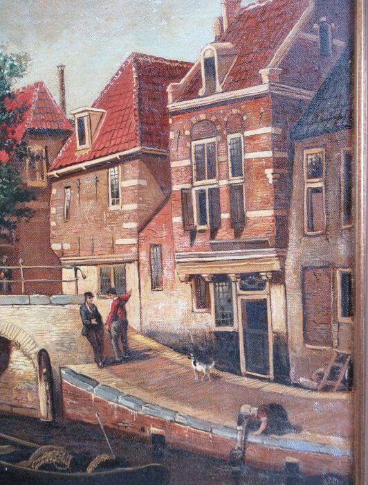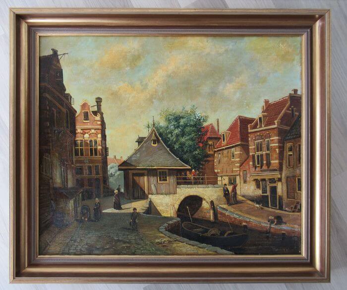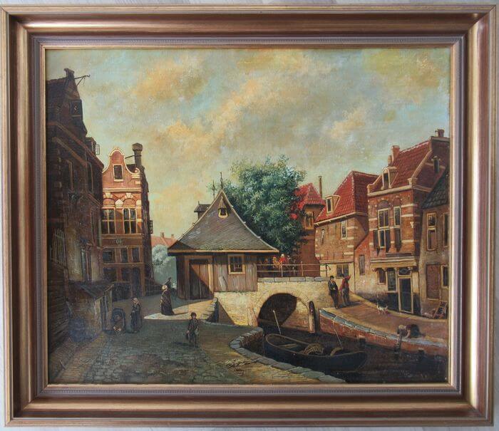 Excellently painted copy of the painting “De Vischbrug over the Oude Rijn in Woerden”, which Cornelis Springer (Amsterdam 25.5.1817 – Hilversum 20.2.1891) made in 1854 (see last photo). This original has been loaned to the City Museum Woerden by the current owner.