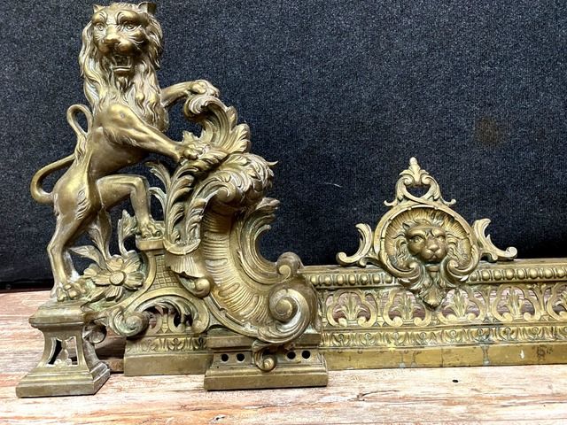 Beautiful pair of andirons with triumphant lions in gilded bronze0